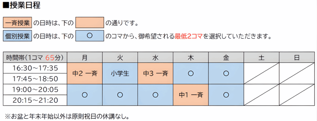 | 授業曜日 | 月~金曜日 ※お盆と年末年始以外、原則祝日の休講はなし |