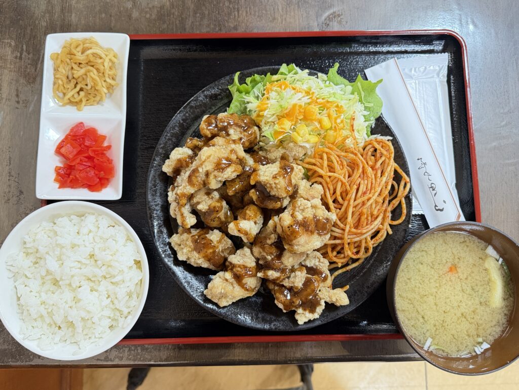 比較的食べやすいサイズの唐揚げが山盛り、ご飯とお味噌汁、2種類のお漬物、そしてサラダにナポリタンまでついてきます!