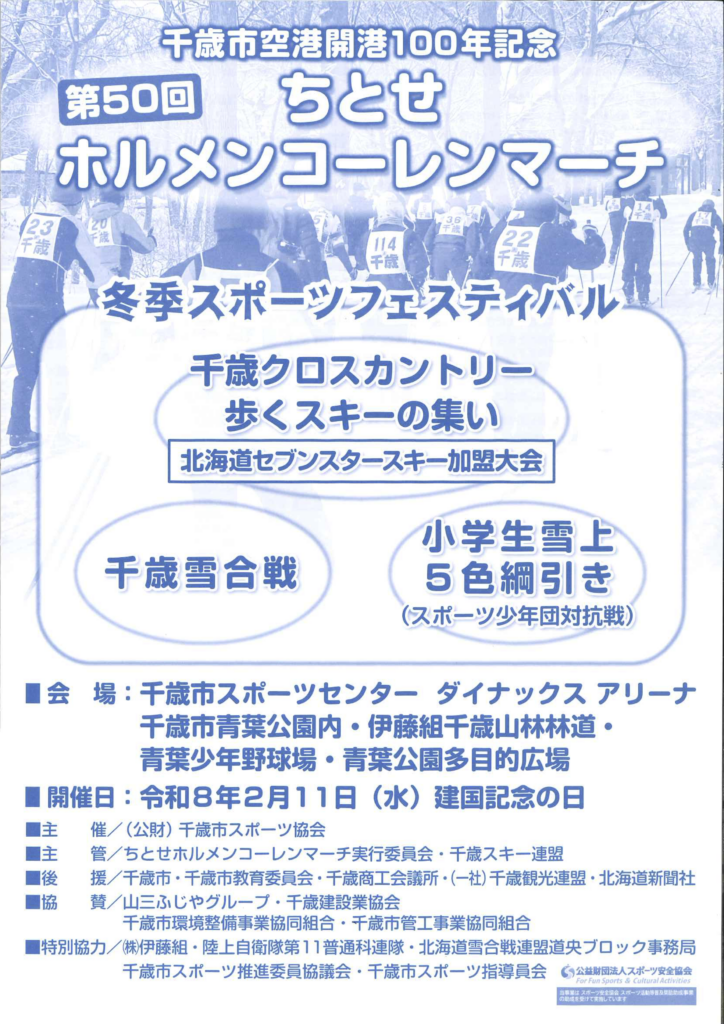 | 主催等 | 主催:(公財)千歳市スポーツ協会 主管:ちとせホルメンコーレンマーチ実行委員会 千歳スキー連盟 後援:千歳市 千歳市教育委員会 千歳商工会議所 (一社)千歳観光連盟 北海道新聞社 |