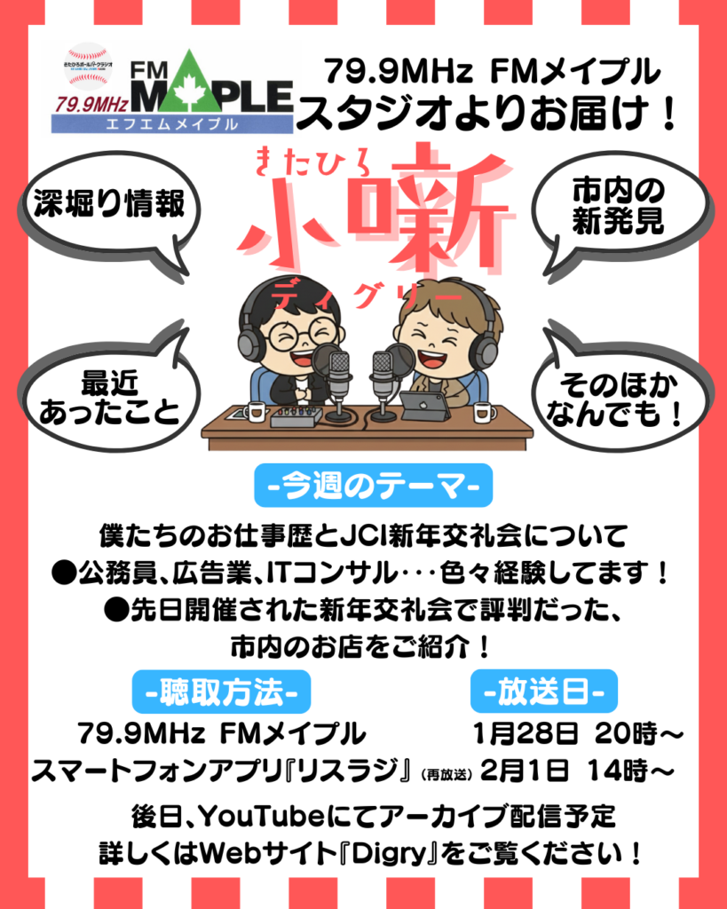 | テーマ | 『宅配サービスわんすま』と『リスラジ』の魅力紹介 | Digryの2人のお仕事歴 JCI新年交流会で評判だったお店紹介 |