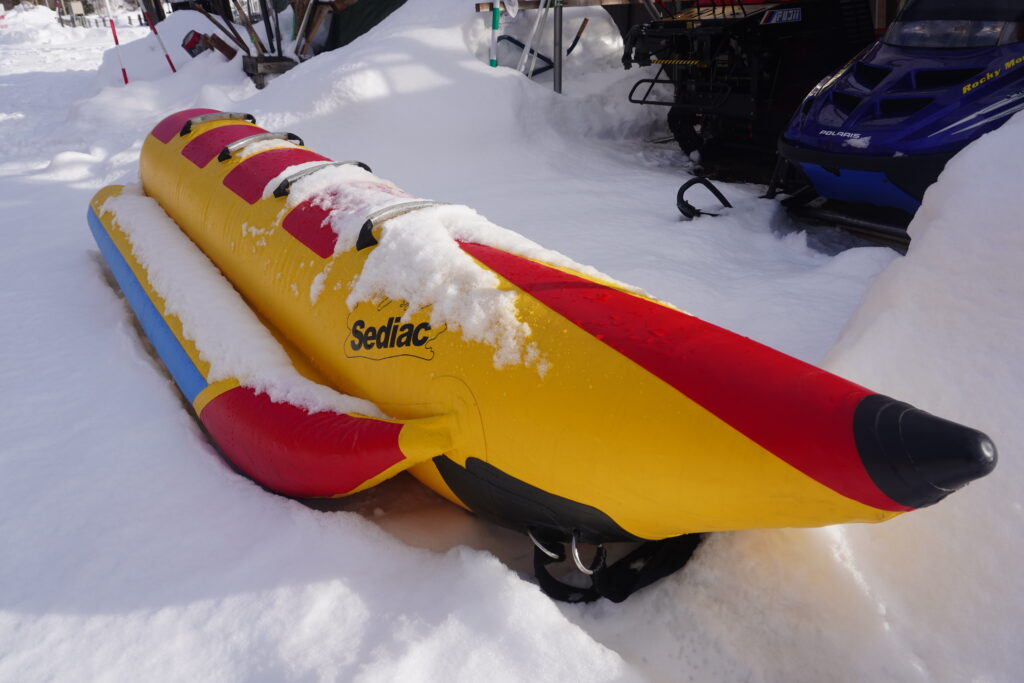 雪の上を歩きやすくするスノーシューのレンタルや、そりすべり、スノーモービルで引っ張られる雪上バナナボート体験も!