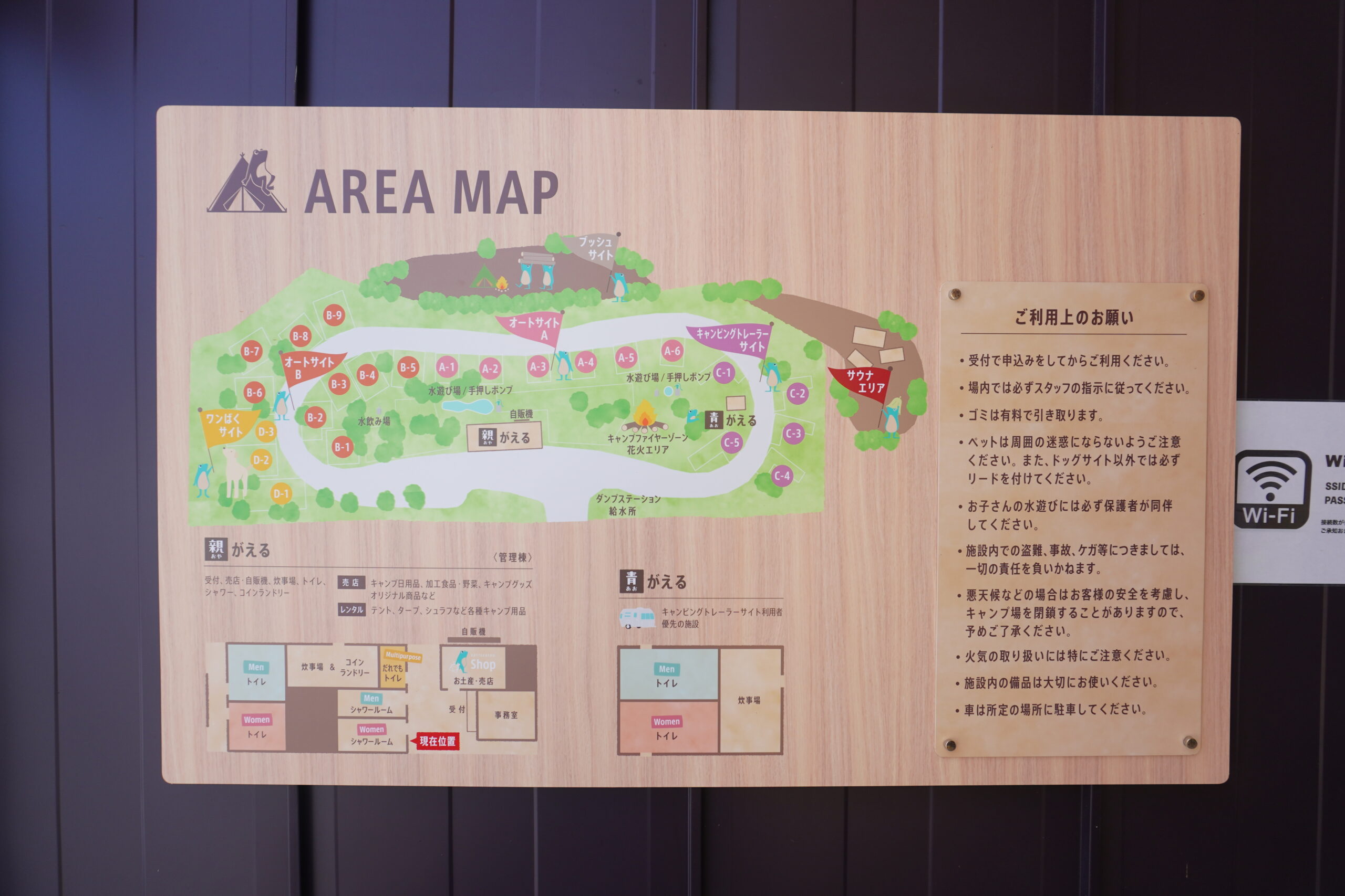| 施設設備 | 管理棟(売店・シャワールーム・トイレ・炊事場・飲食スペースなど) サウナ(バレル、トレーラー、テント) ドッグガーデン(ドッグラン) |