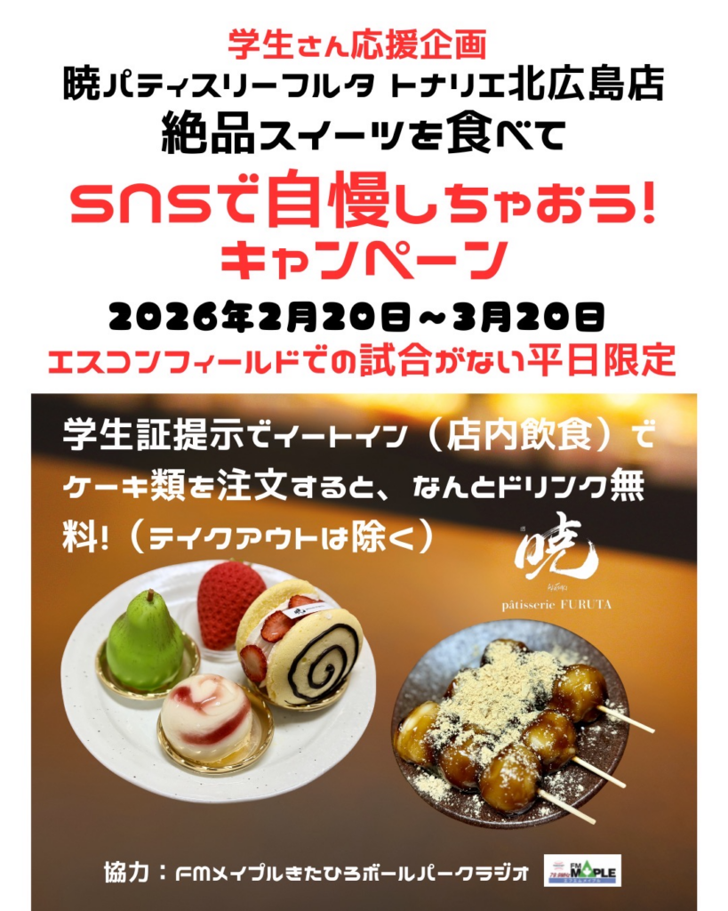 そんな『暁パティスリーフルタ トナリエ北広島店』でこの度、お得な学生さん応援企画がスタート!