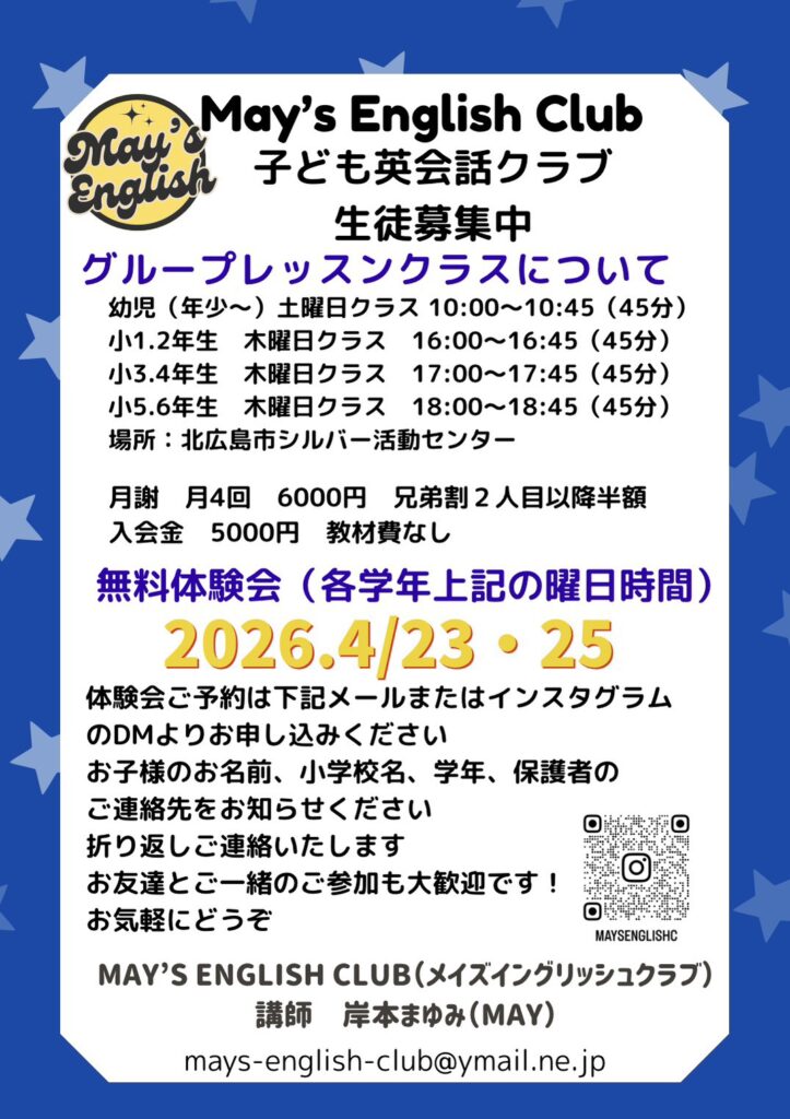 お申し込みはメール(mays-english-club@ymail.ne.jp)か、InstagramのDM(https://www.instagram.com/maysenglishclub25/)までご連絡ください!