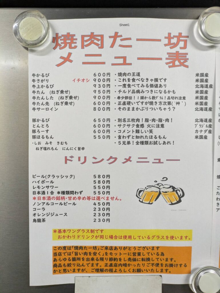 【焼肉たー坊&肉やりょうちく】3月のメニュー表