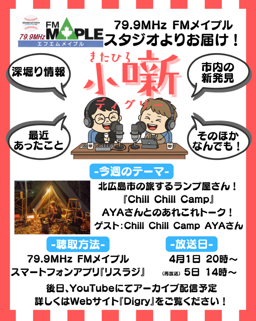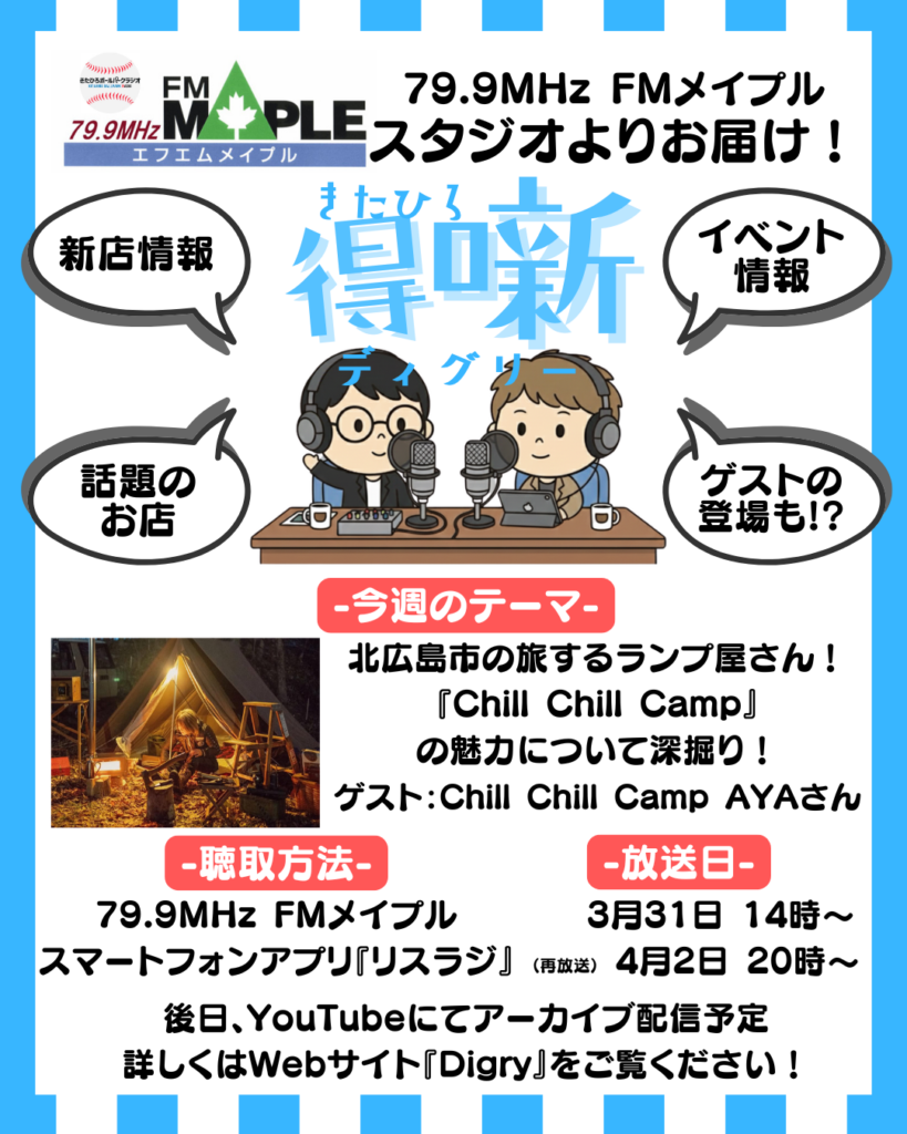 ウェブサイトにて掲載中、北広島市の旅するランプ屋さん『Chill Chill Camp』さんをゲストにお迎えし、お店の情報や魅力、現在の活動について深掘りします!