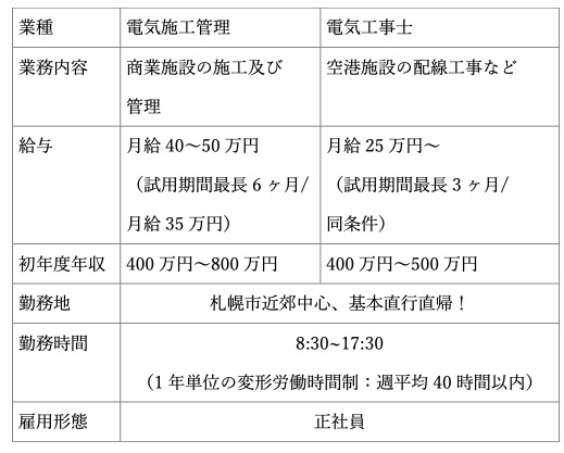 現在経験の有無問わず、電気施工管理と電気工事士を募集しています。詳しくは募集要項をご覧いただくか、ご連絡をいただければ対応します!