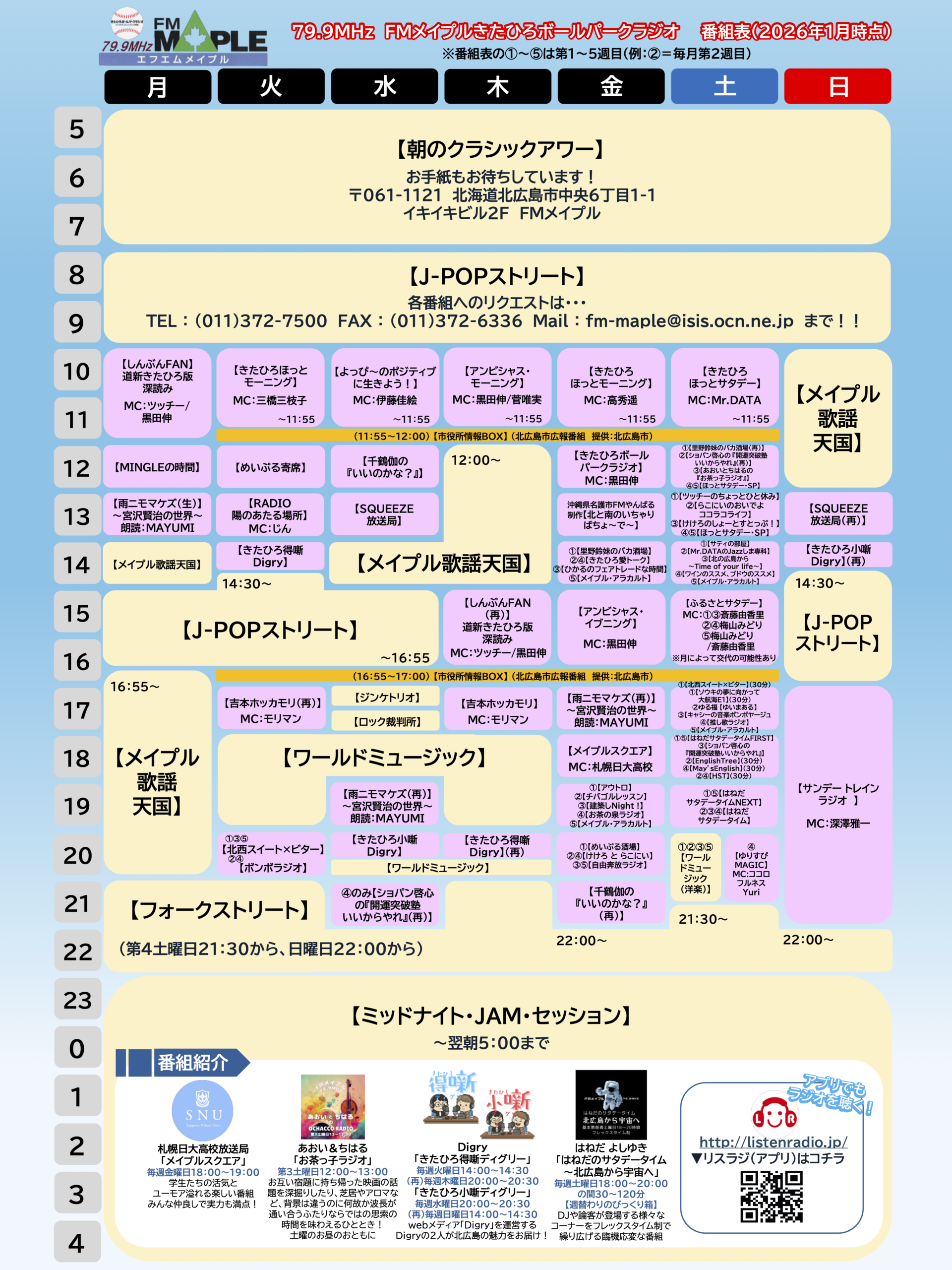 番組表をご覧になって、FMメイプルきたひろボールパークラジオの番組をお楽しみください♪