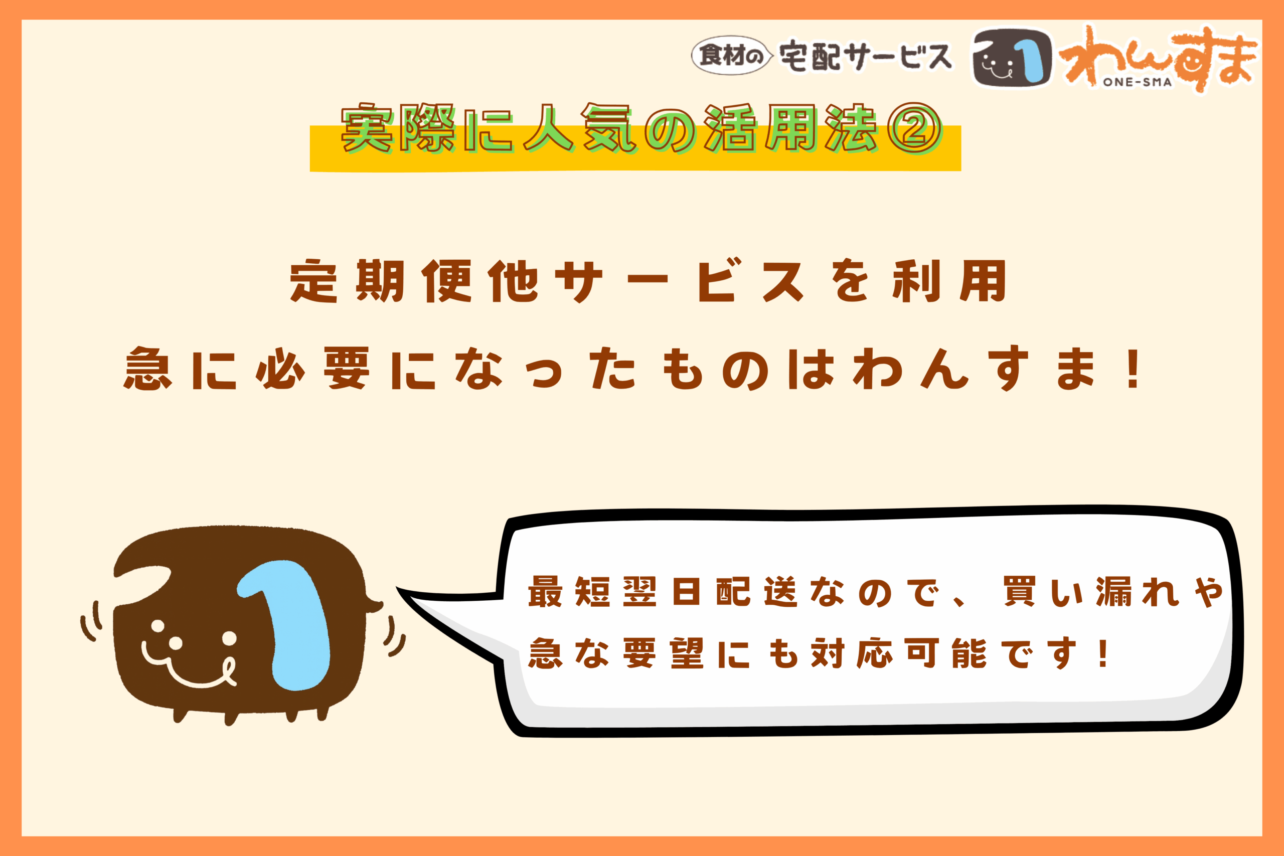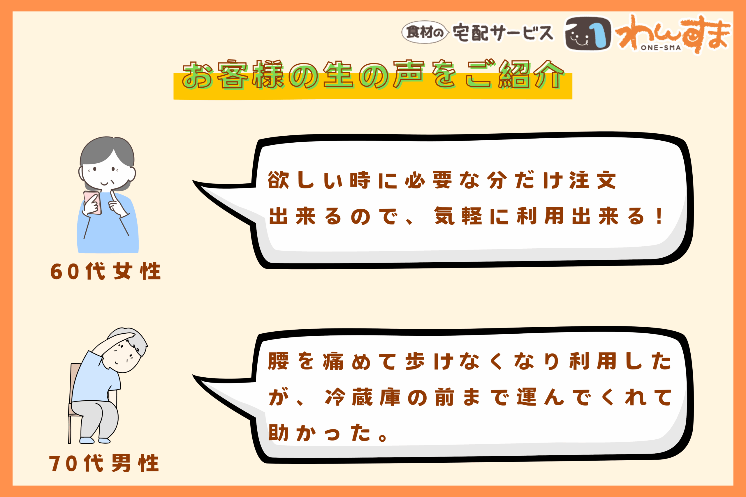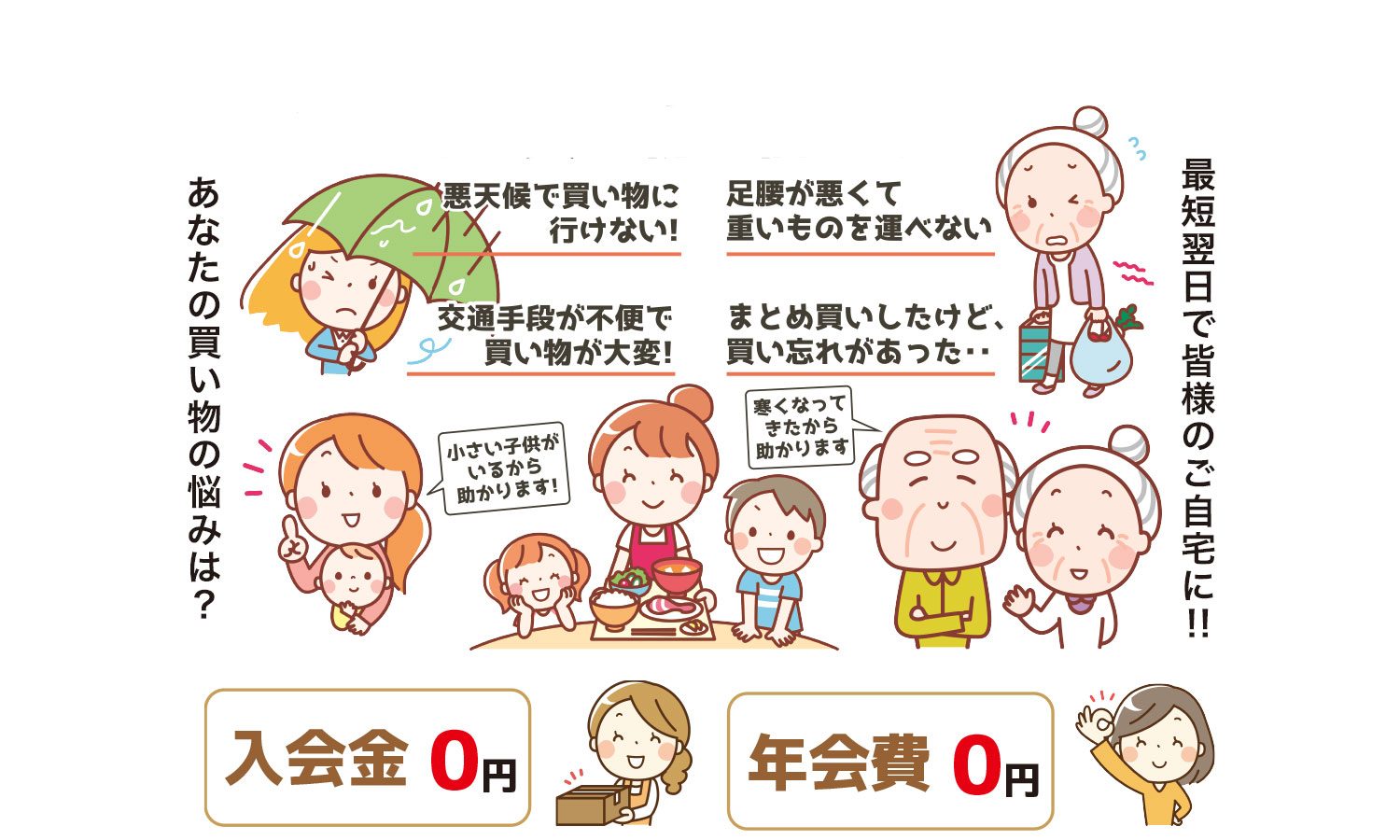 なので突然の怪我や悪天候、特に台風や積雪の際、ご自身で買い物に行くのが不安な方や、ご家族が心配だけどお迎えに行く時間が取れない方には特におすすめで、保険としても入会しておいてもらえるとお役に立てるかと思います。