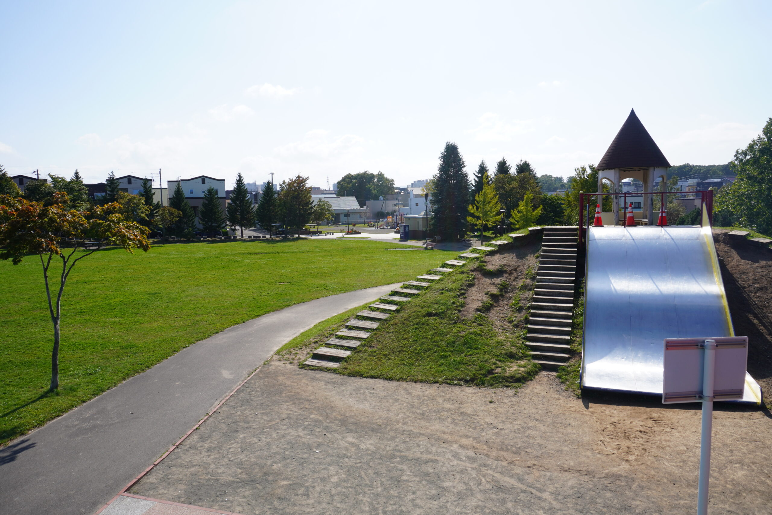 広々とした芝生広場や大きなすべり台など子どもたちに人気の設備がそろった公園です。